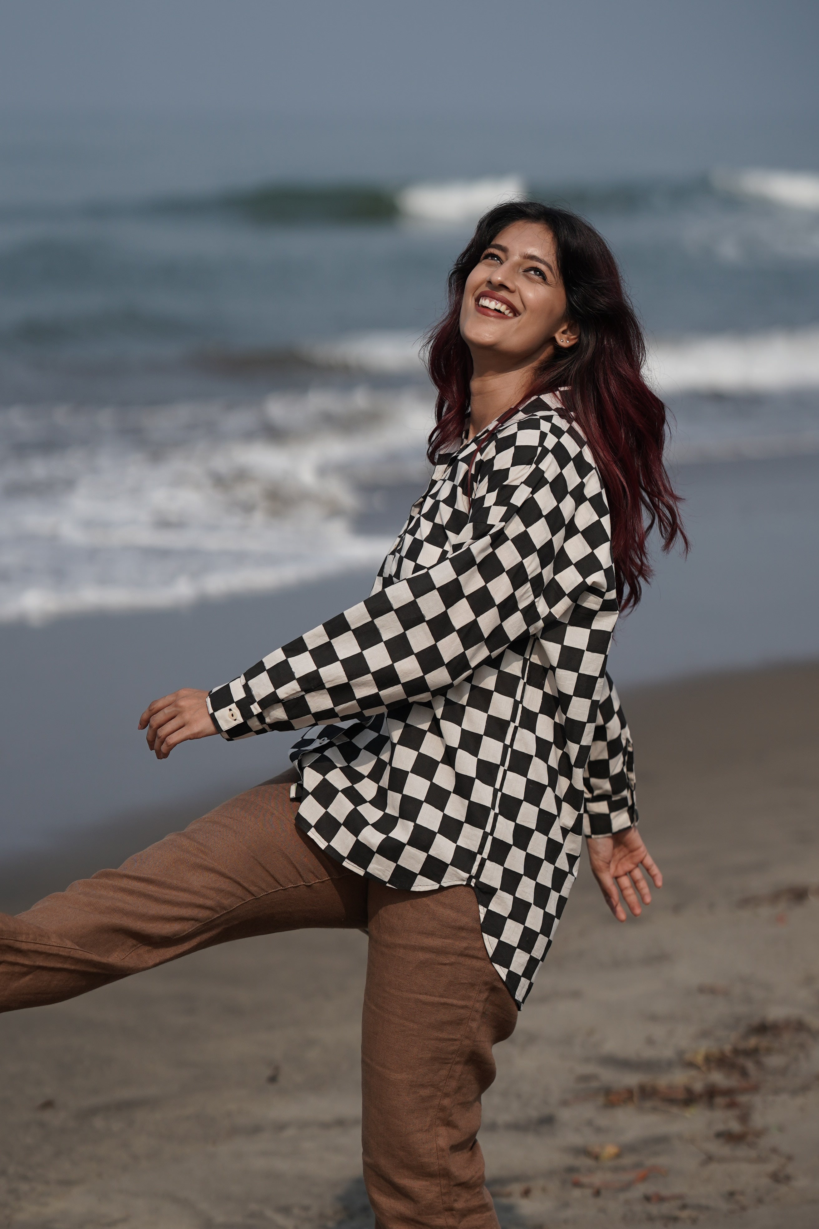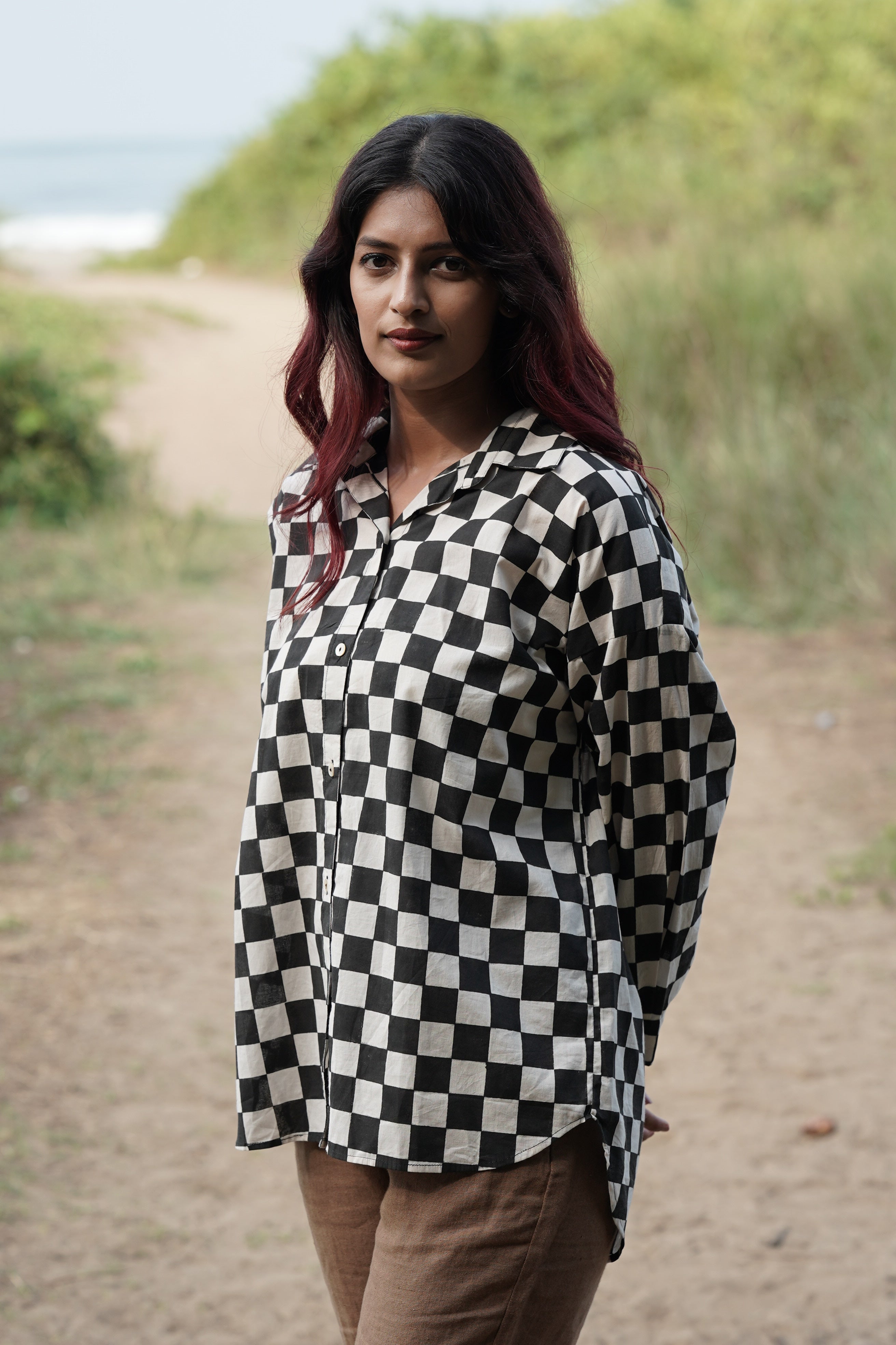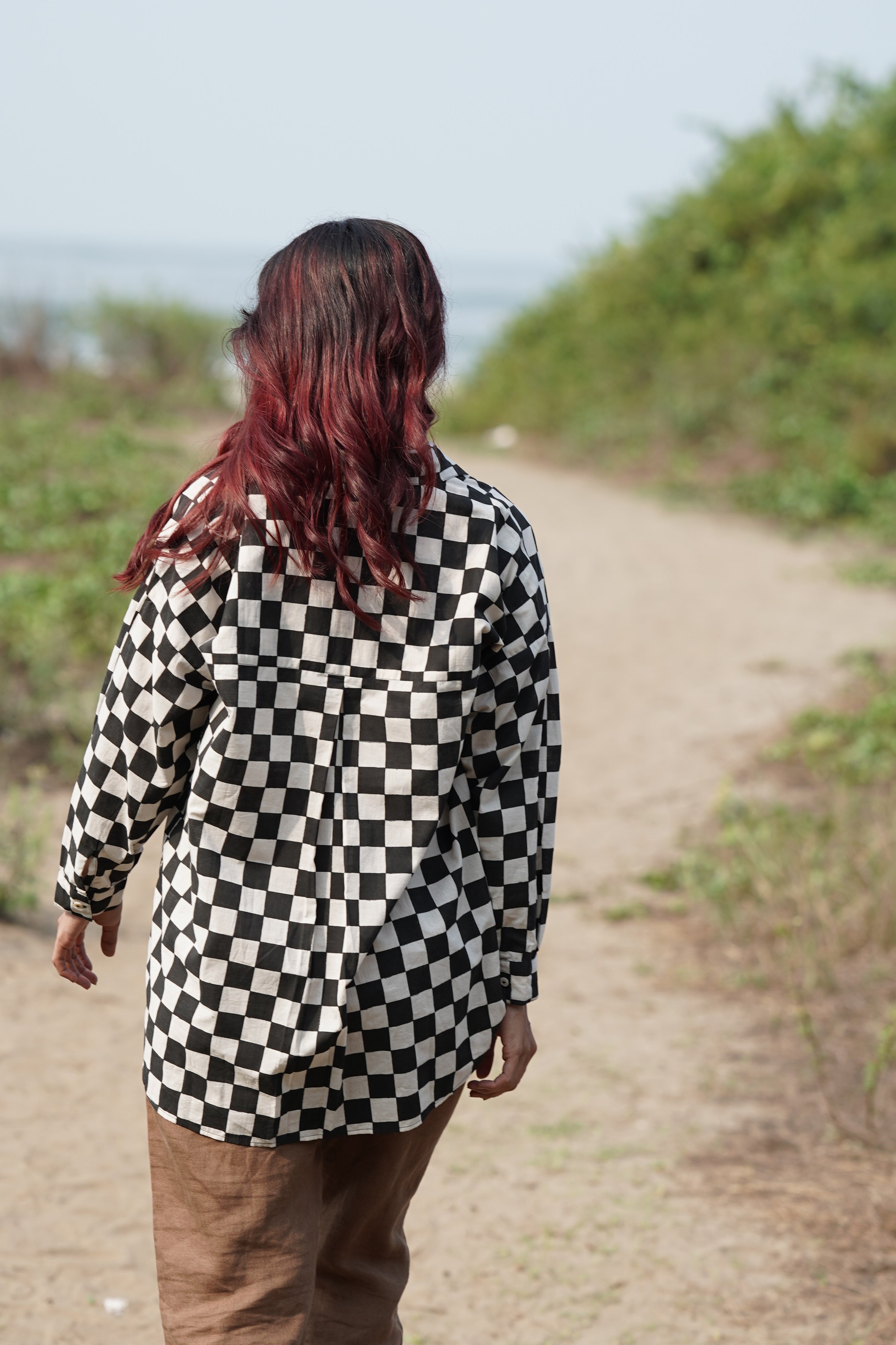 This oversized shirt features bold black-and-white checks that make a statement without trying too hard.
