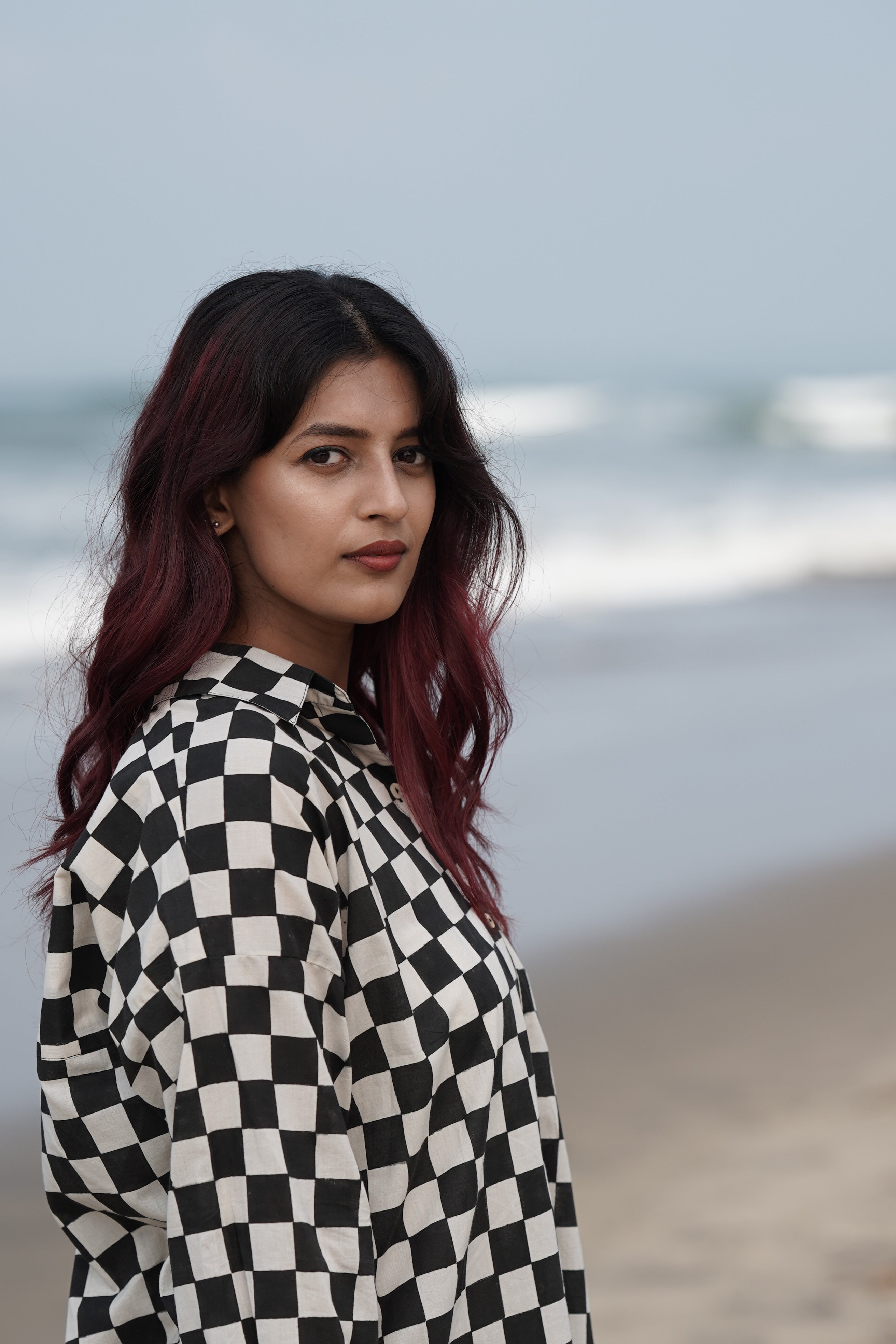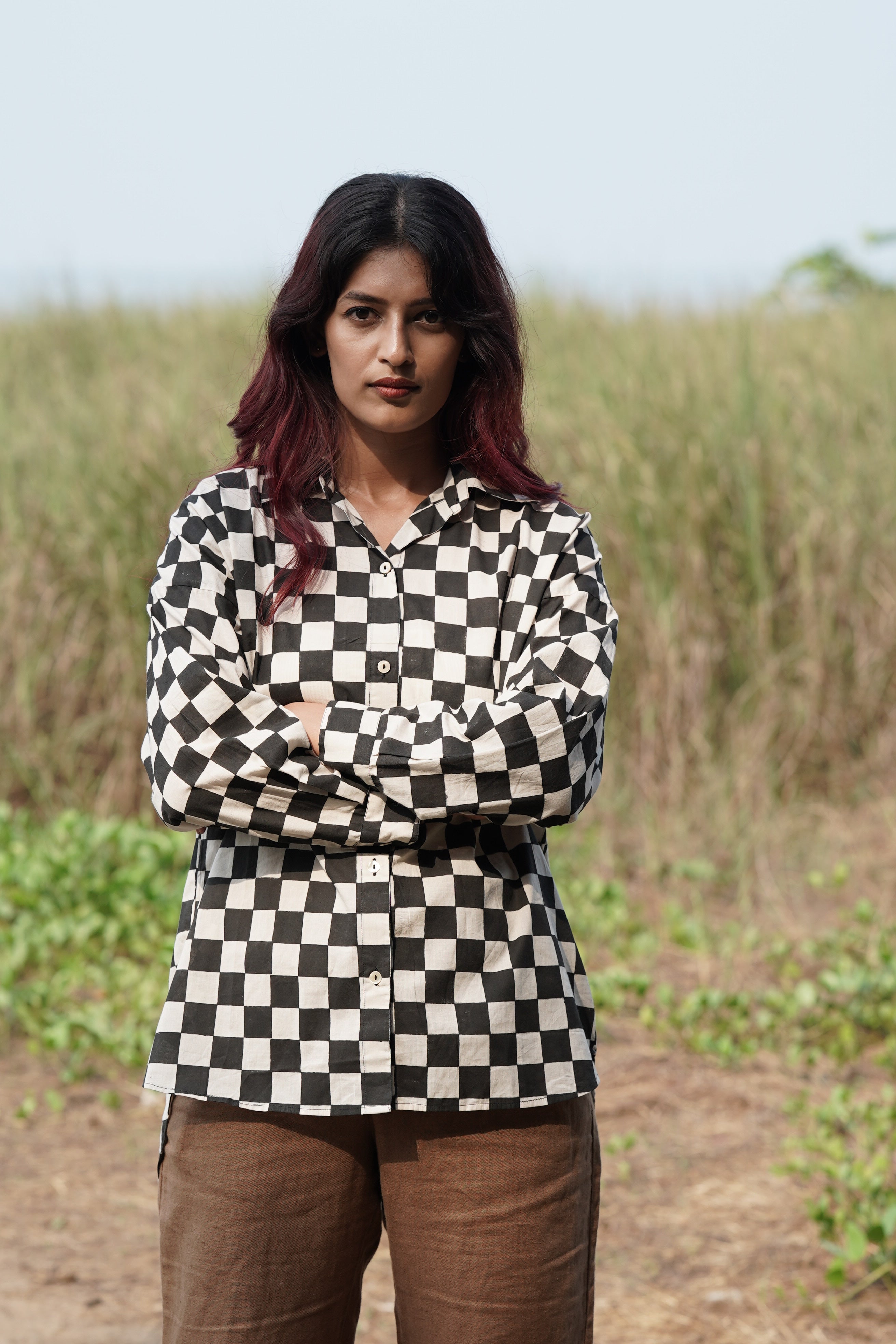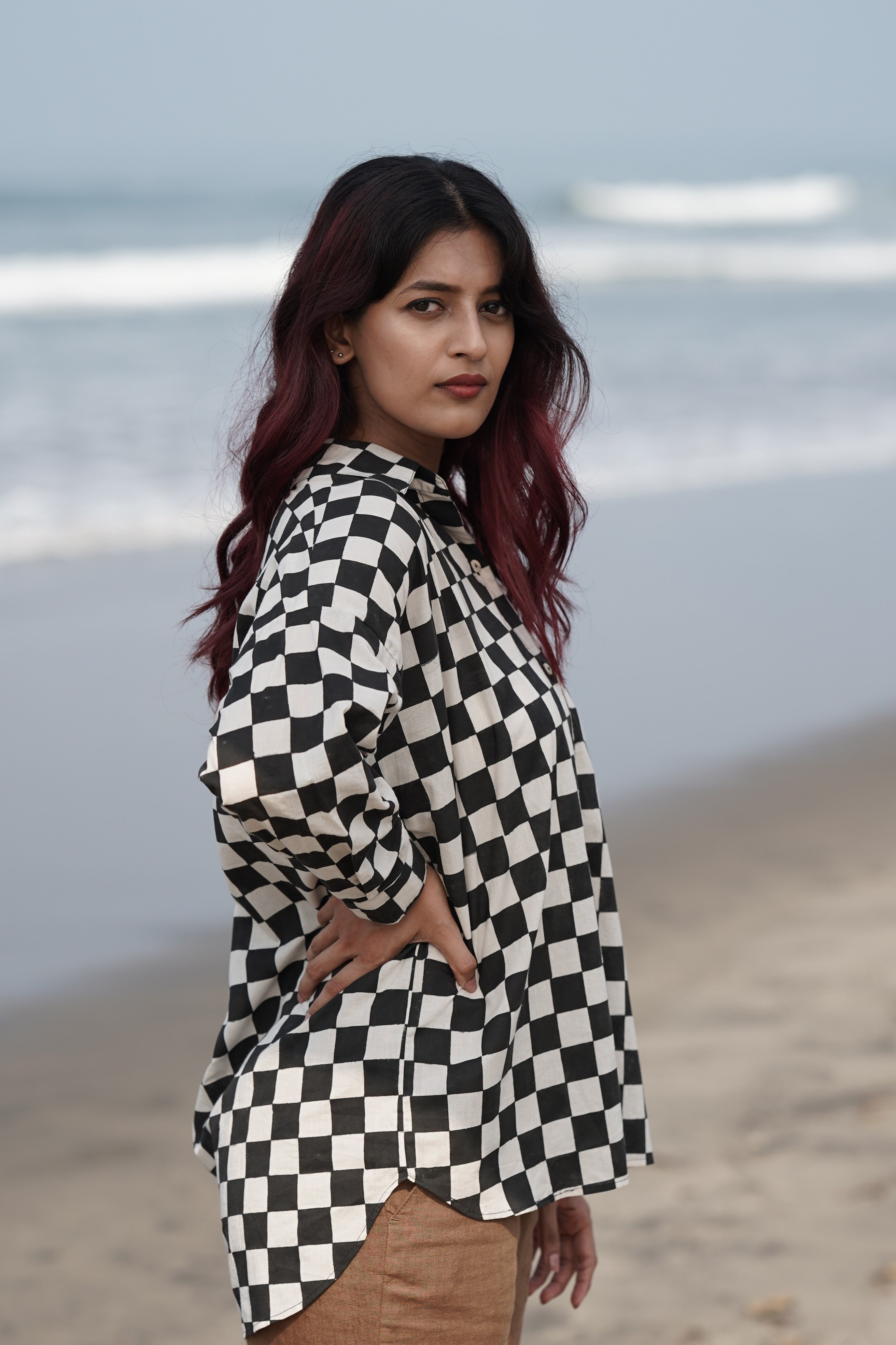 This oversized shirt features bold black-and-white checks that make a statement without trying too hard.