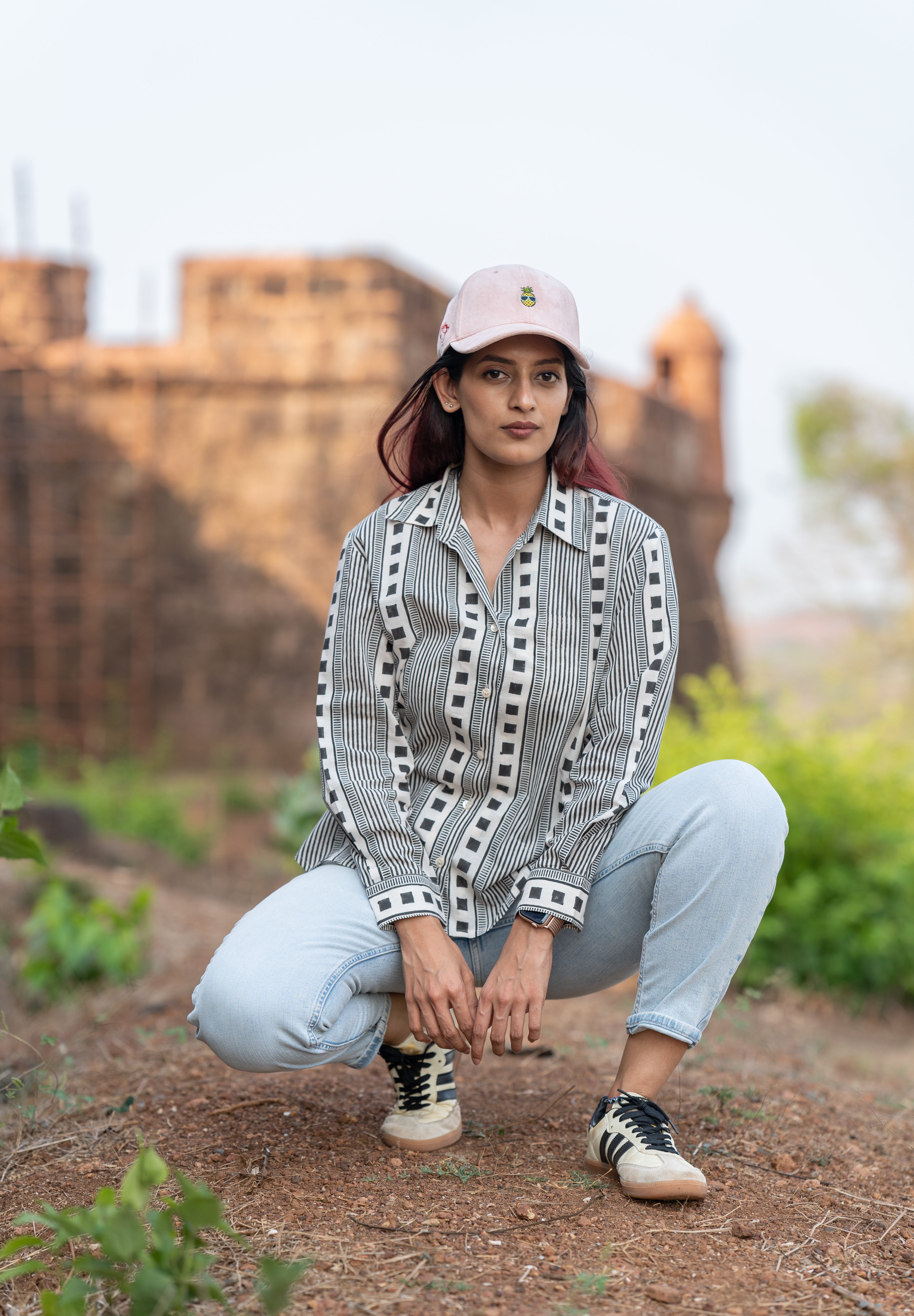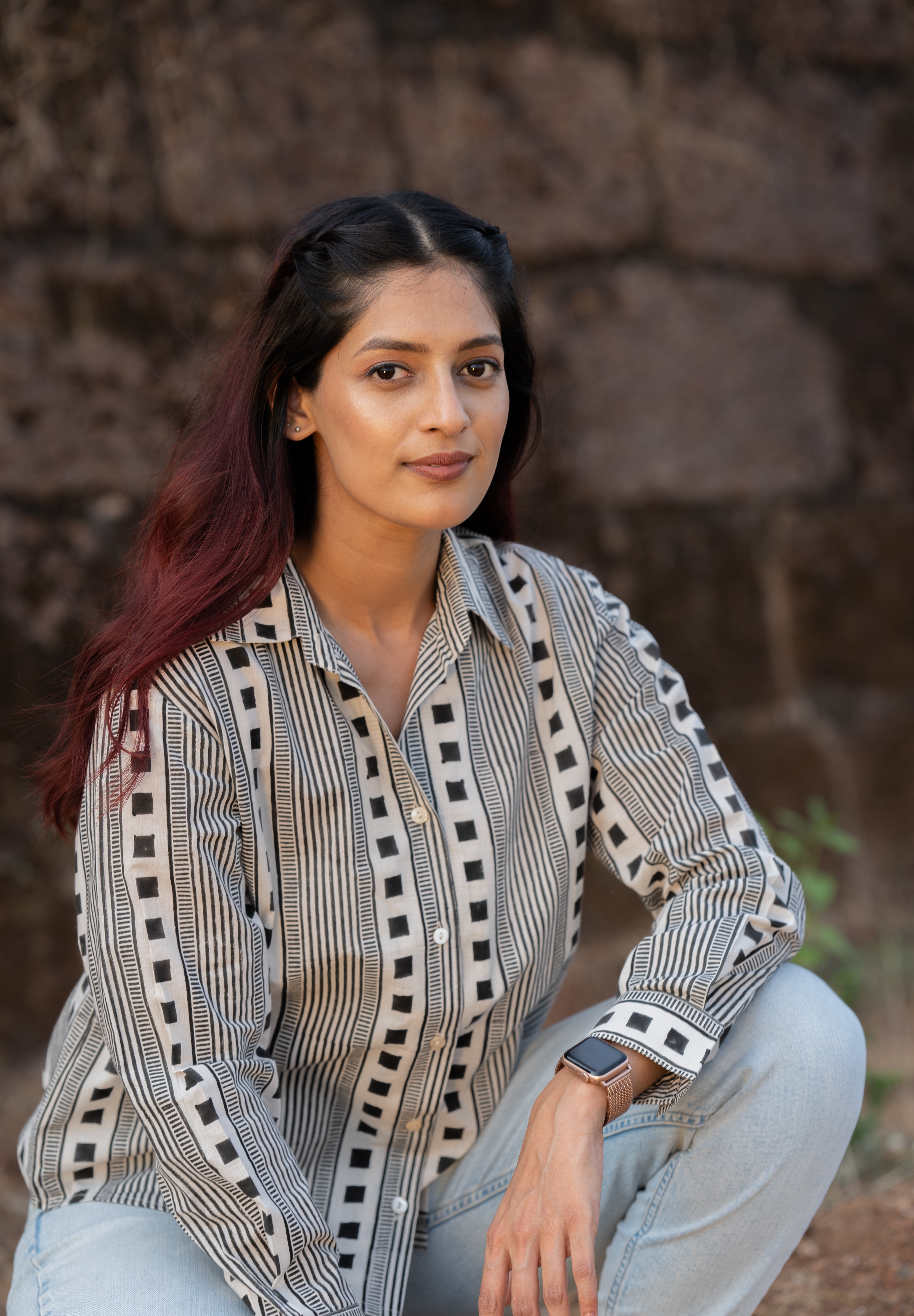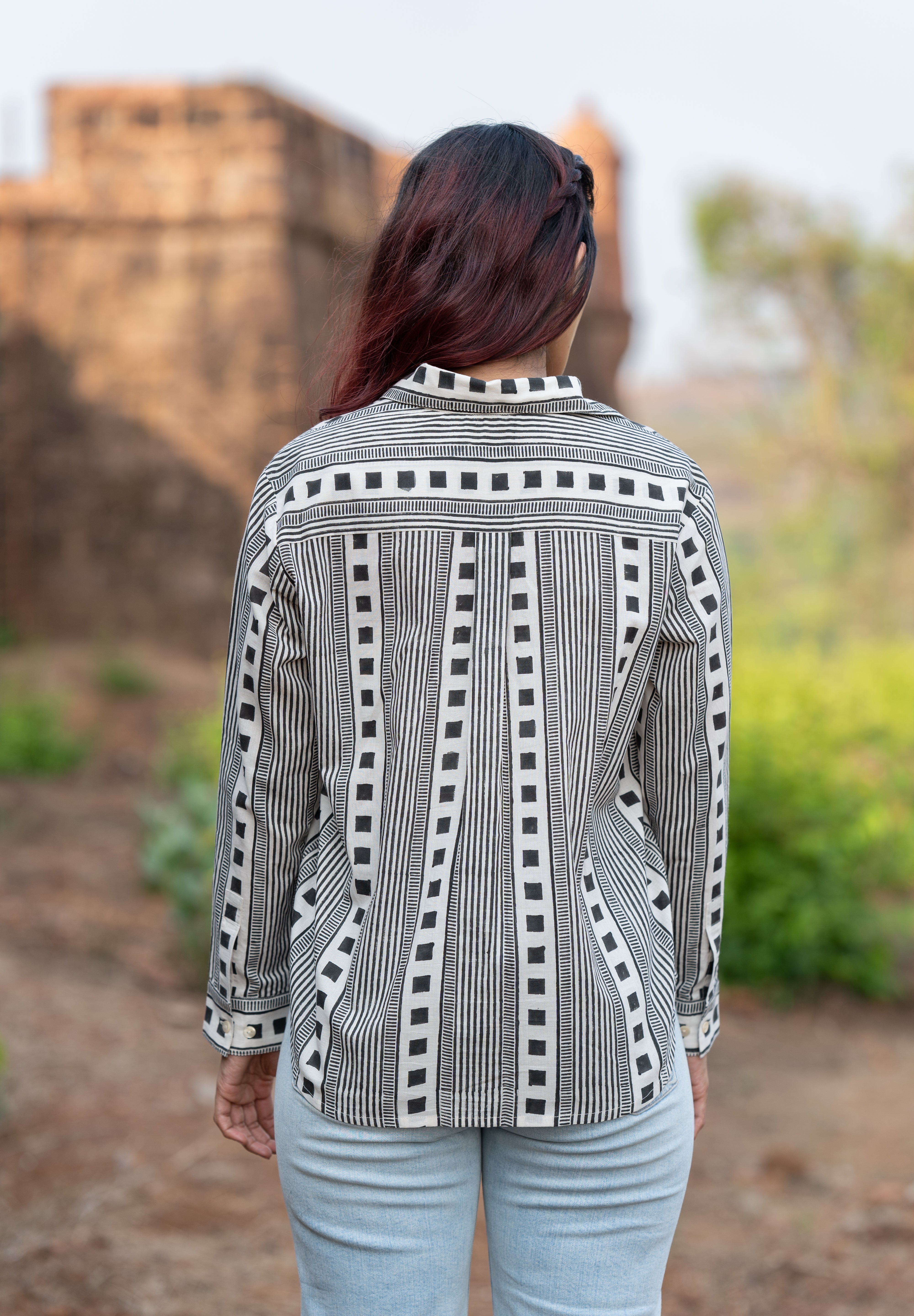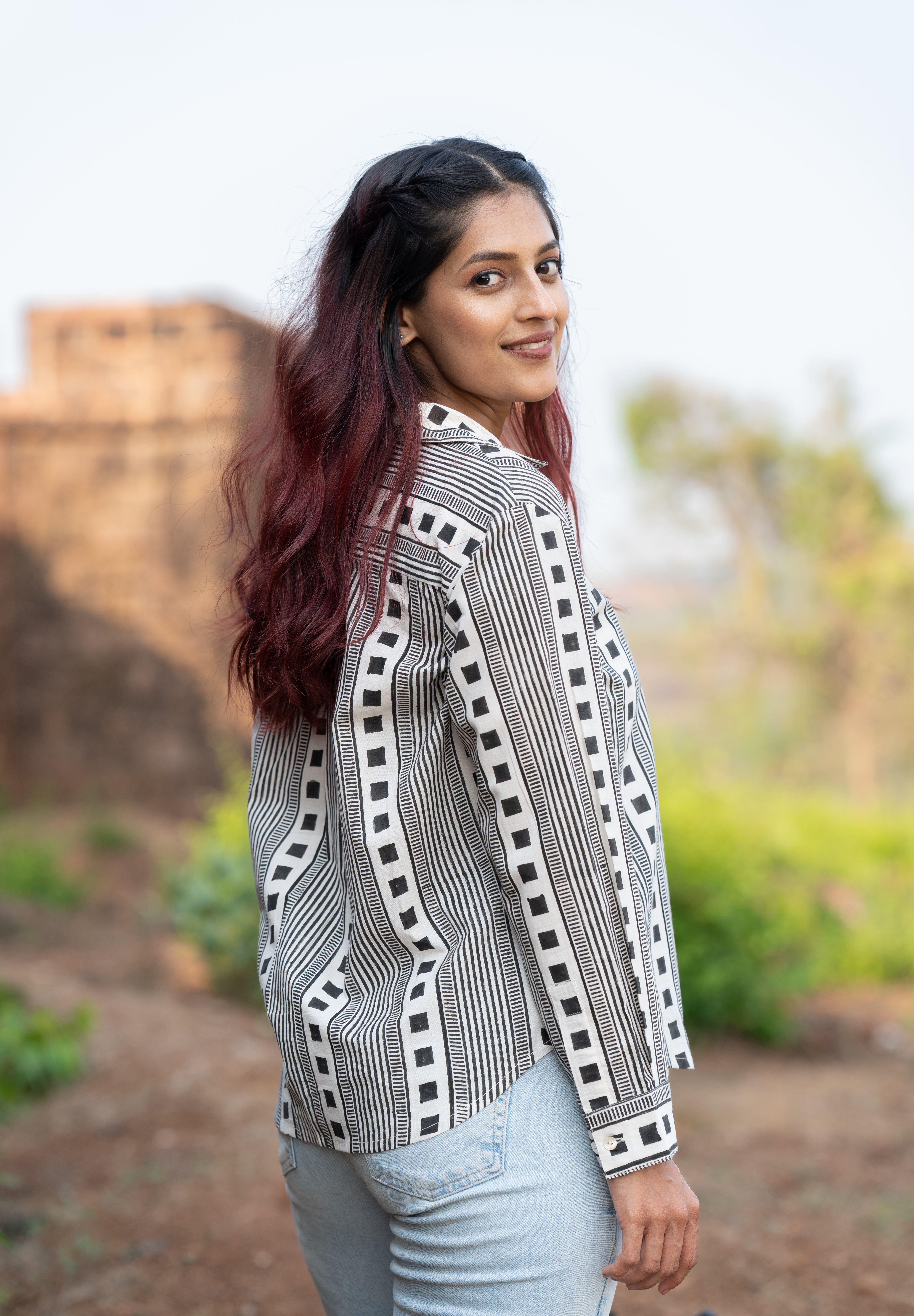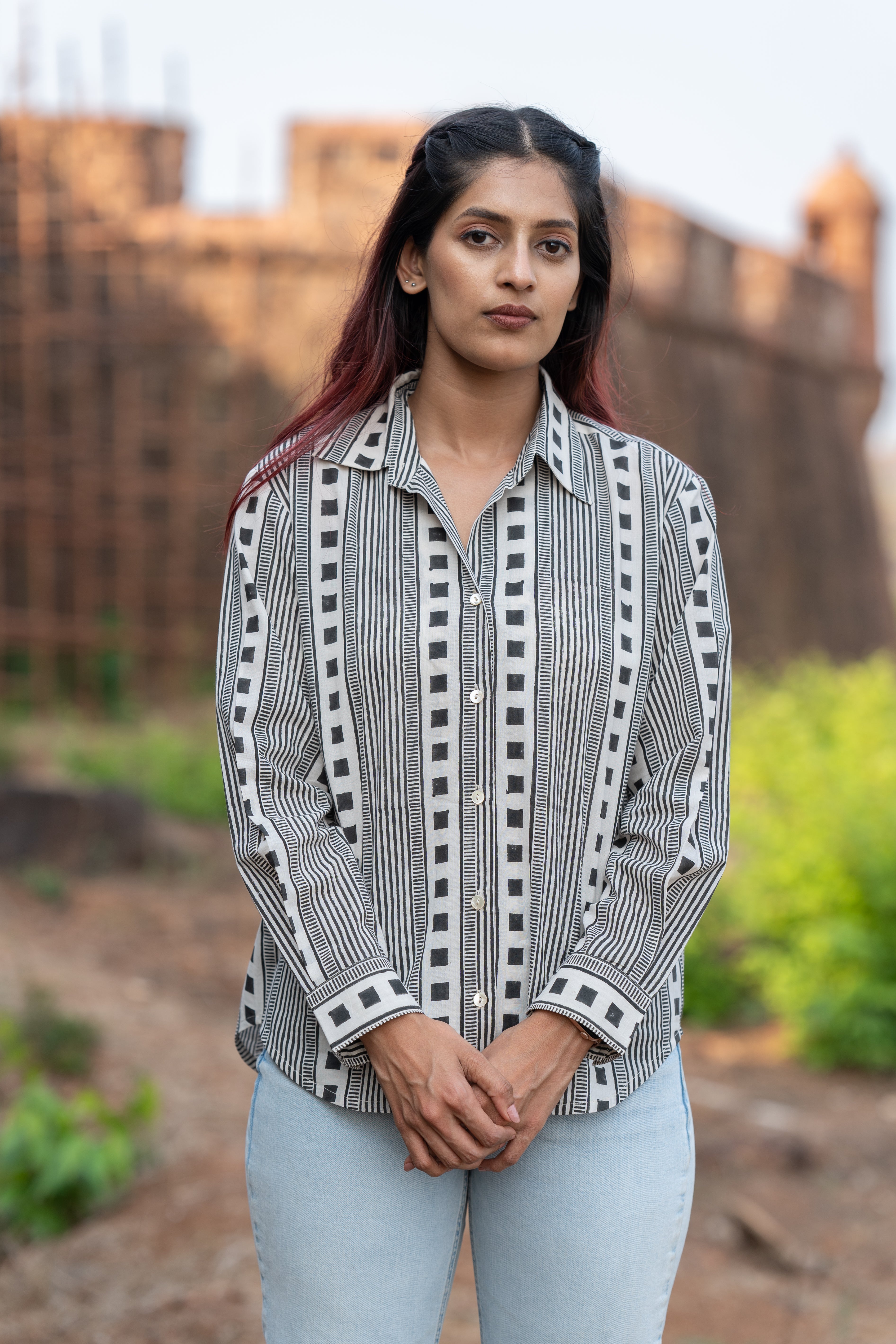 This shirt is fully handblock printed in a structured, graphic layout, clean lines, confident contrasts, and quiet geometry. The print is bold, but never loud. Crafted by artisan hands with intentional irregularities that add depth to its otherwise sharp design.