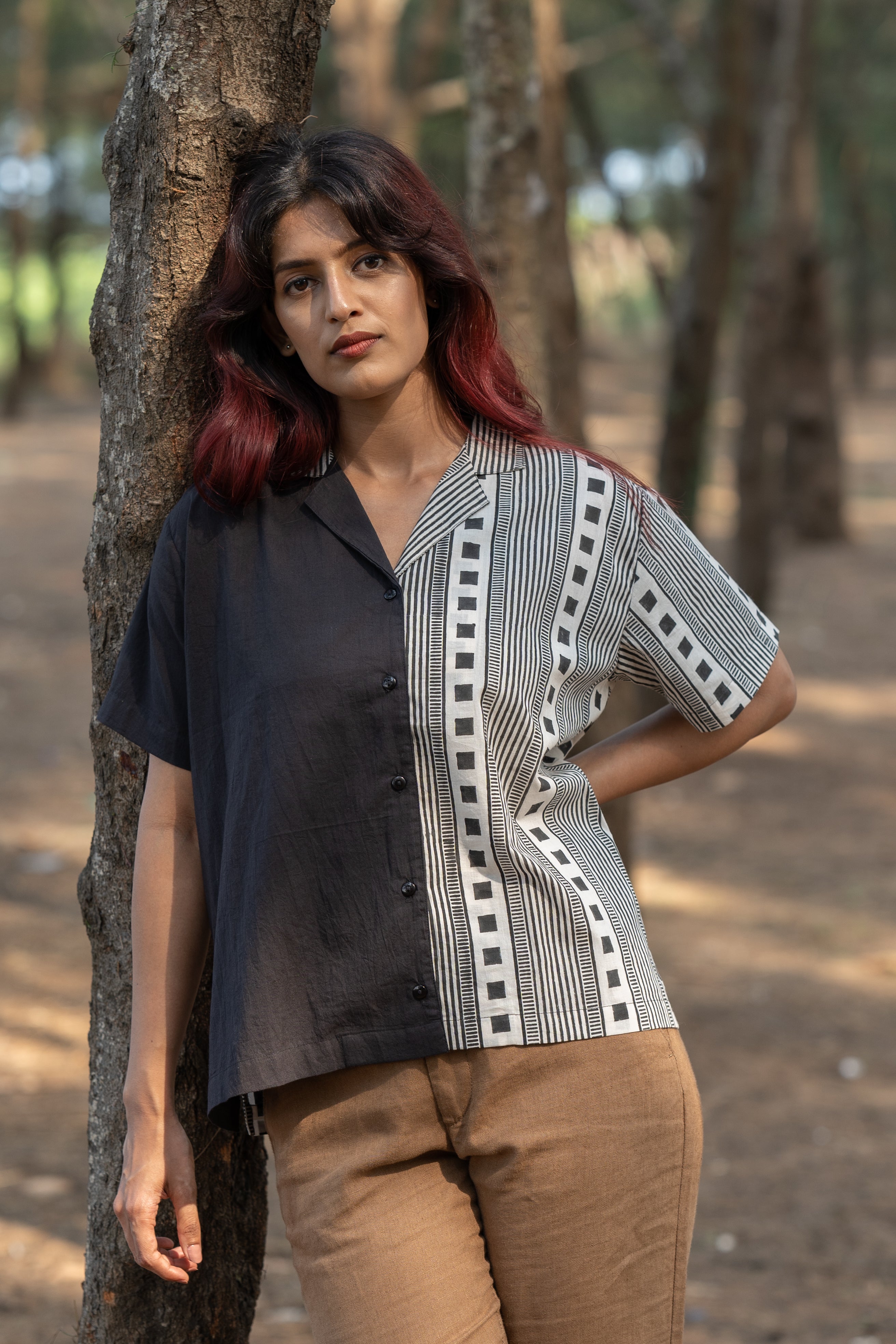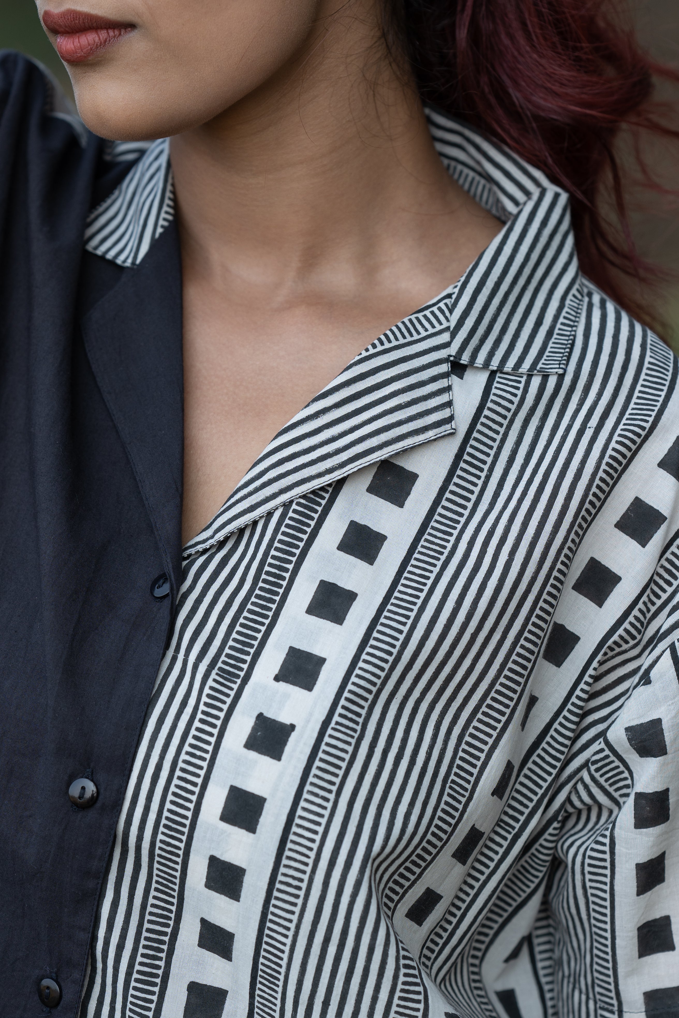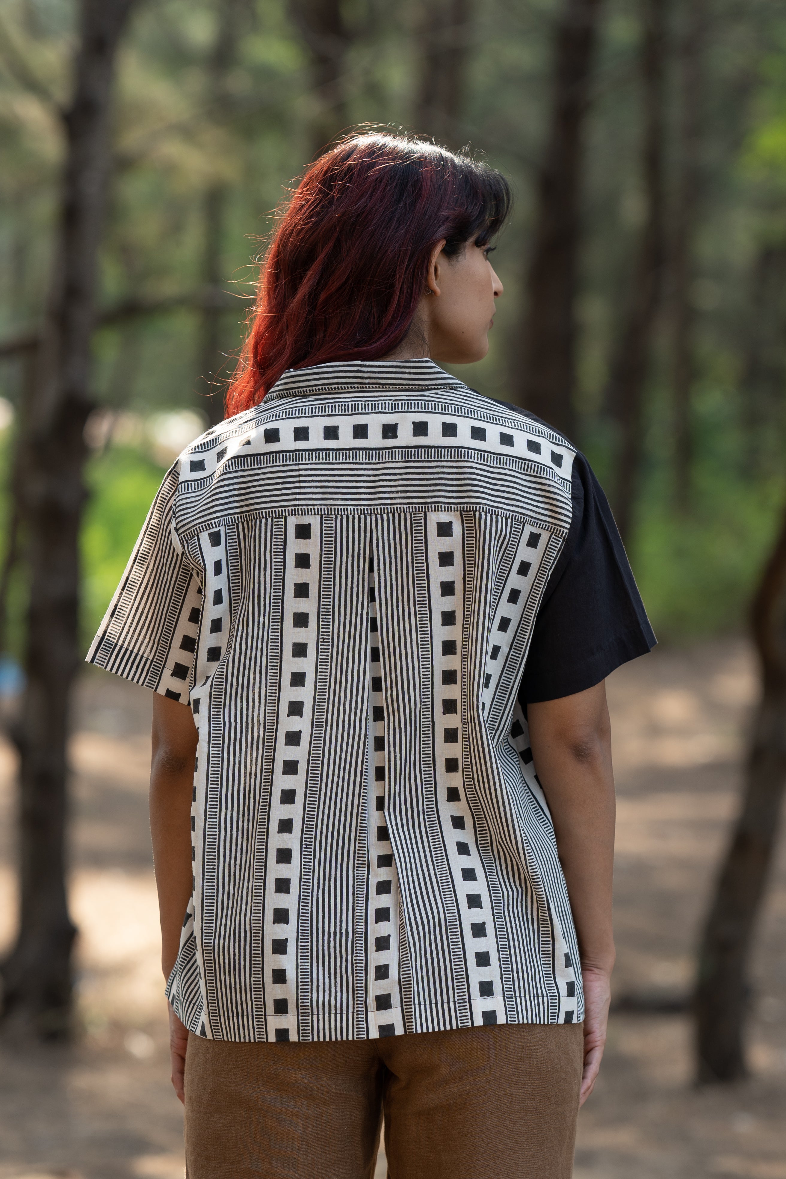 Featuring a striking half-and-half layout, this shirt is handblock printed with clean, deliberate geometry, a study in balance and structure.