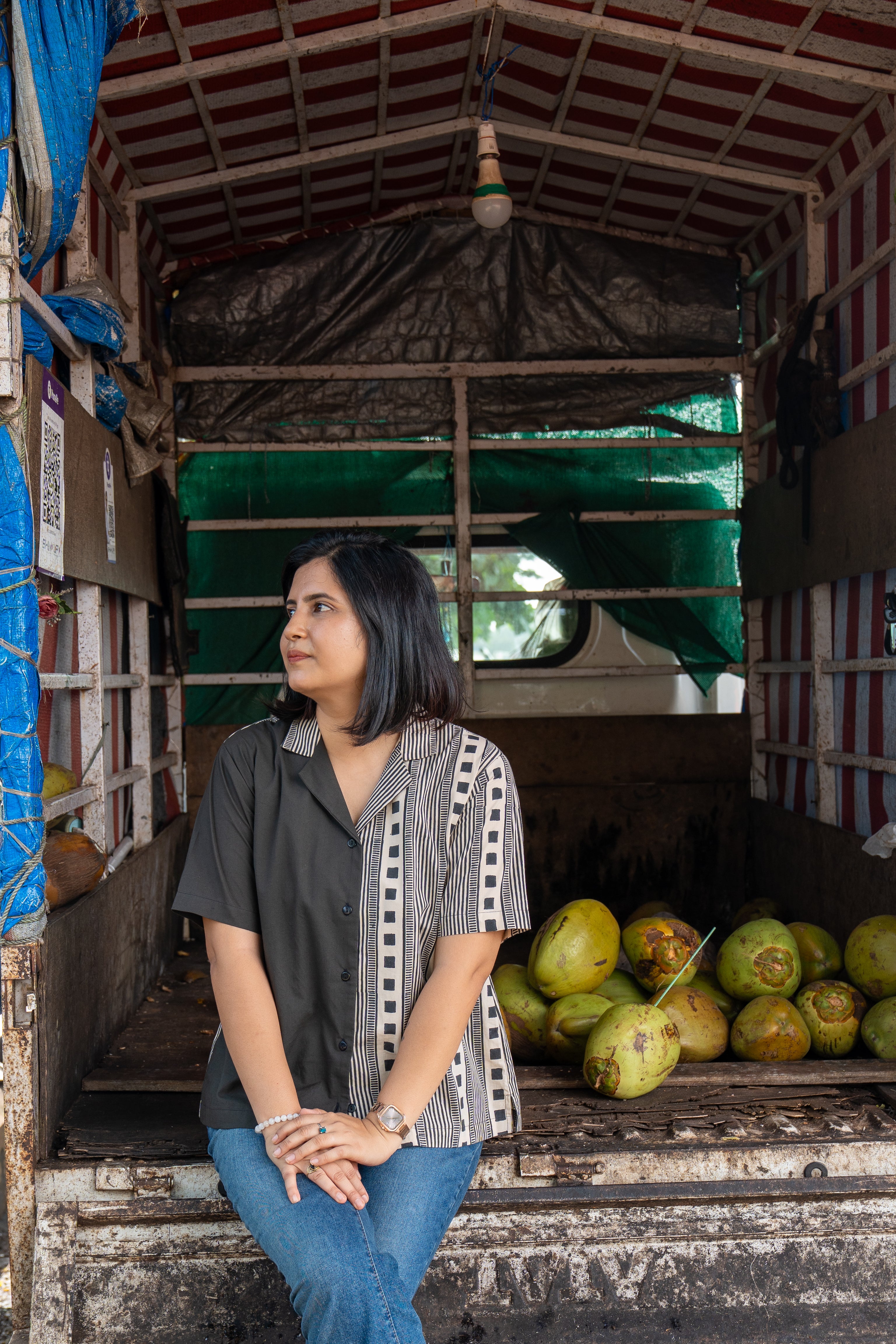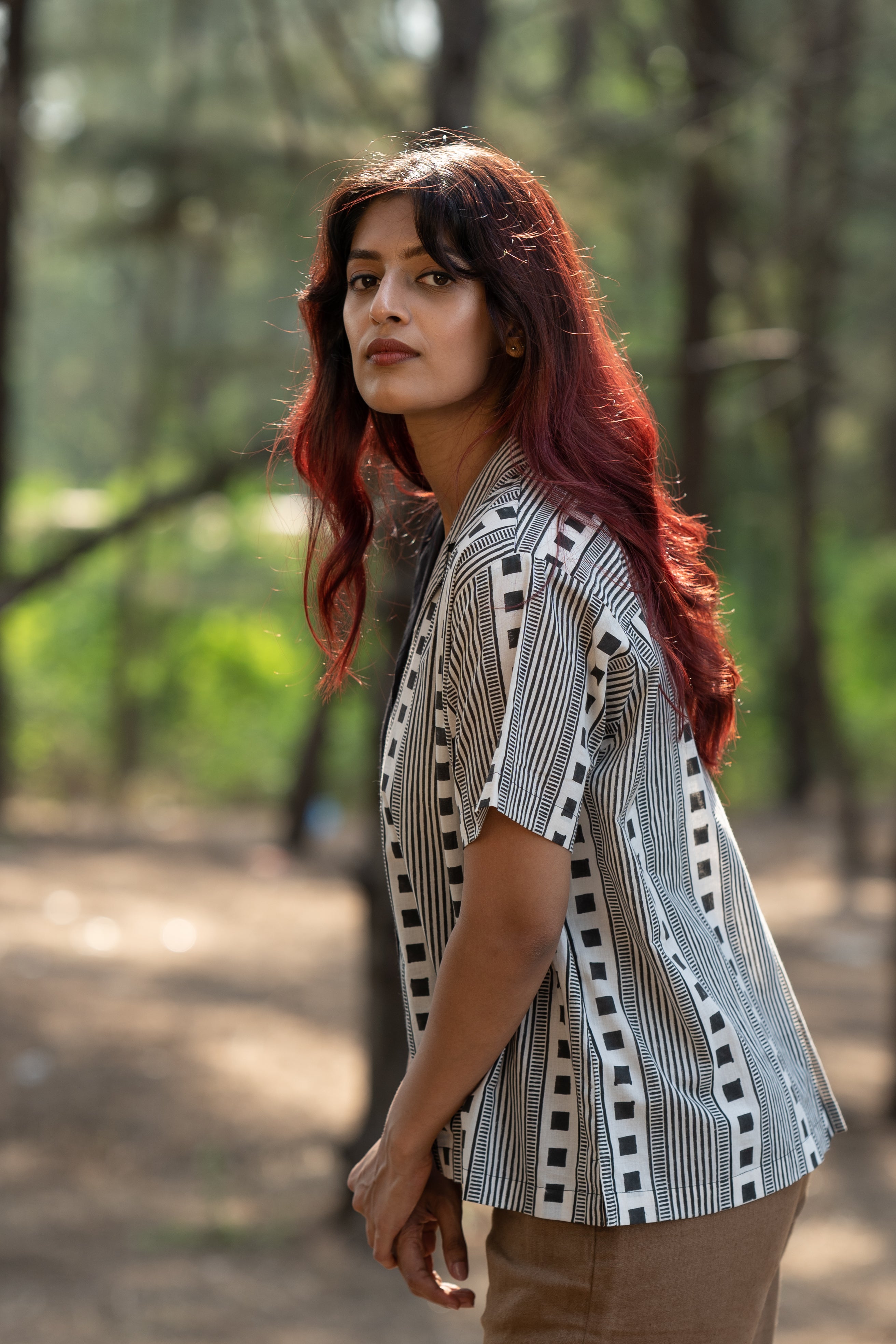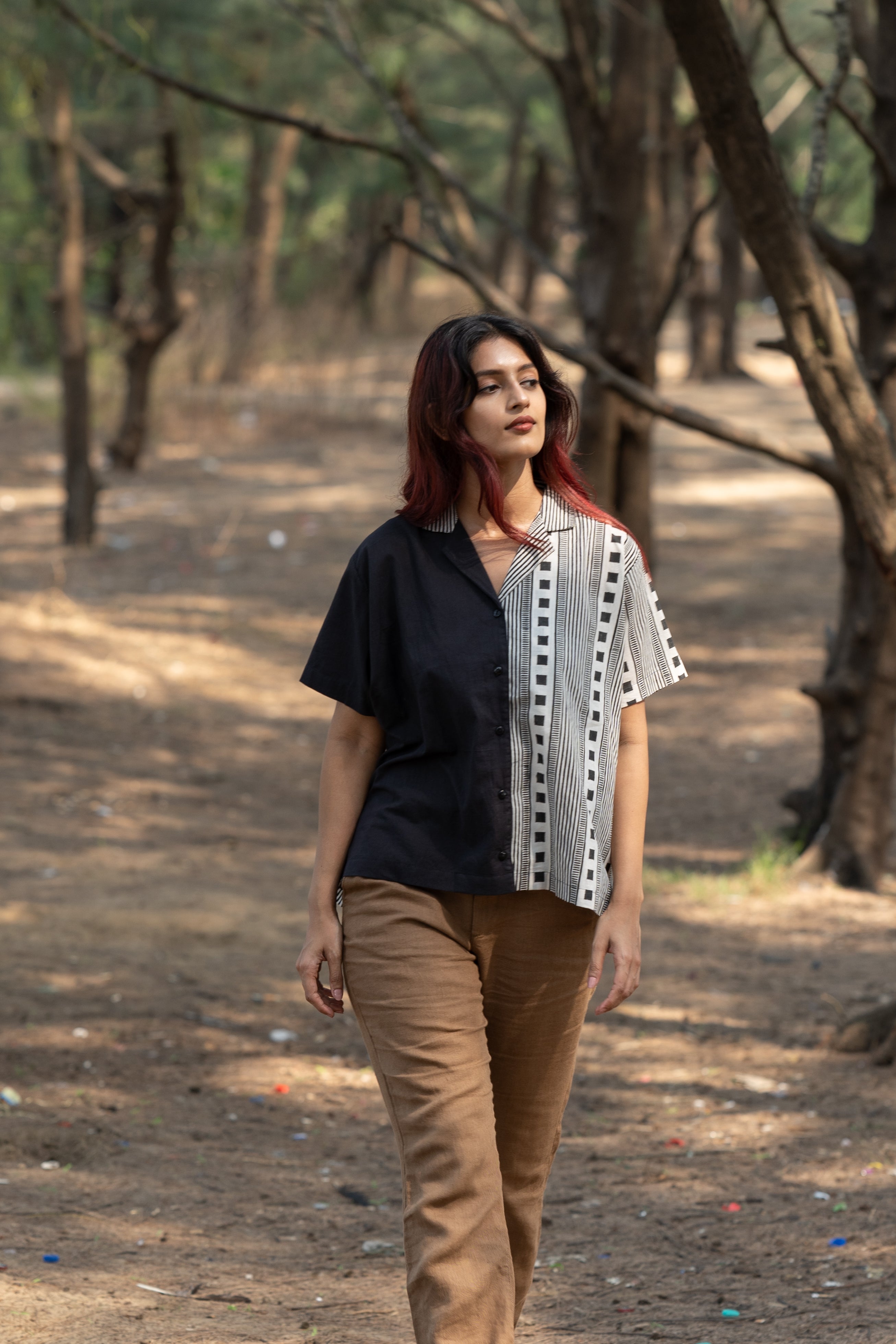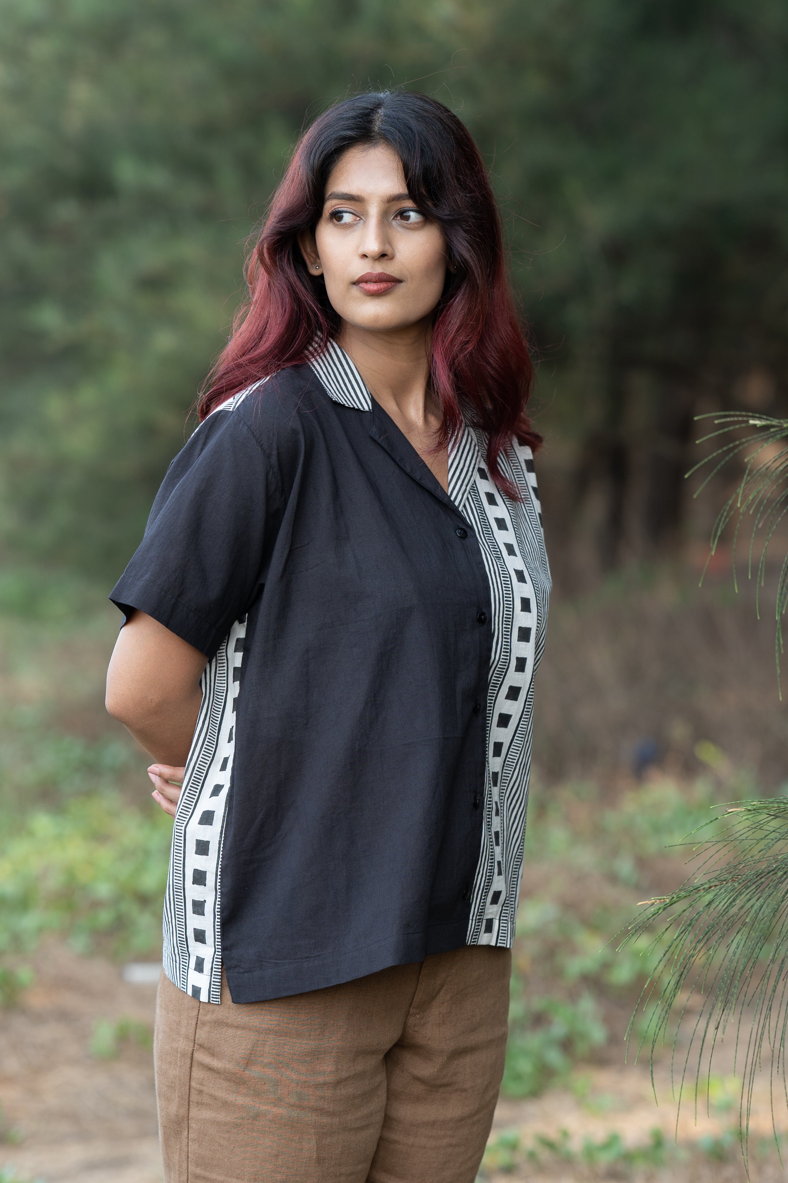 Featuring a striking half-and-half layout, this shirt is handblock printed with clean, deliberate geometry, a study in balance and structure.