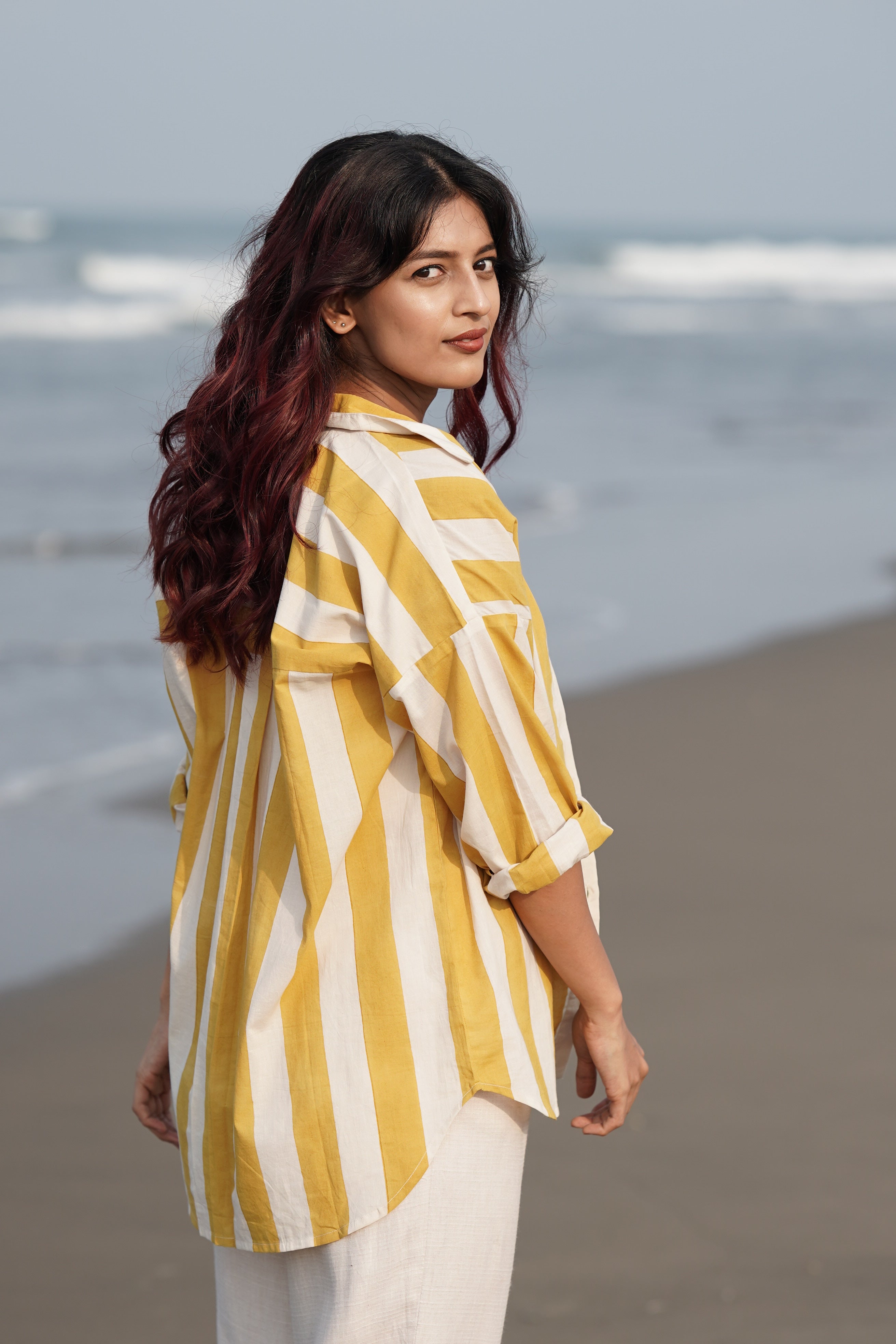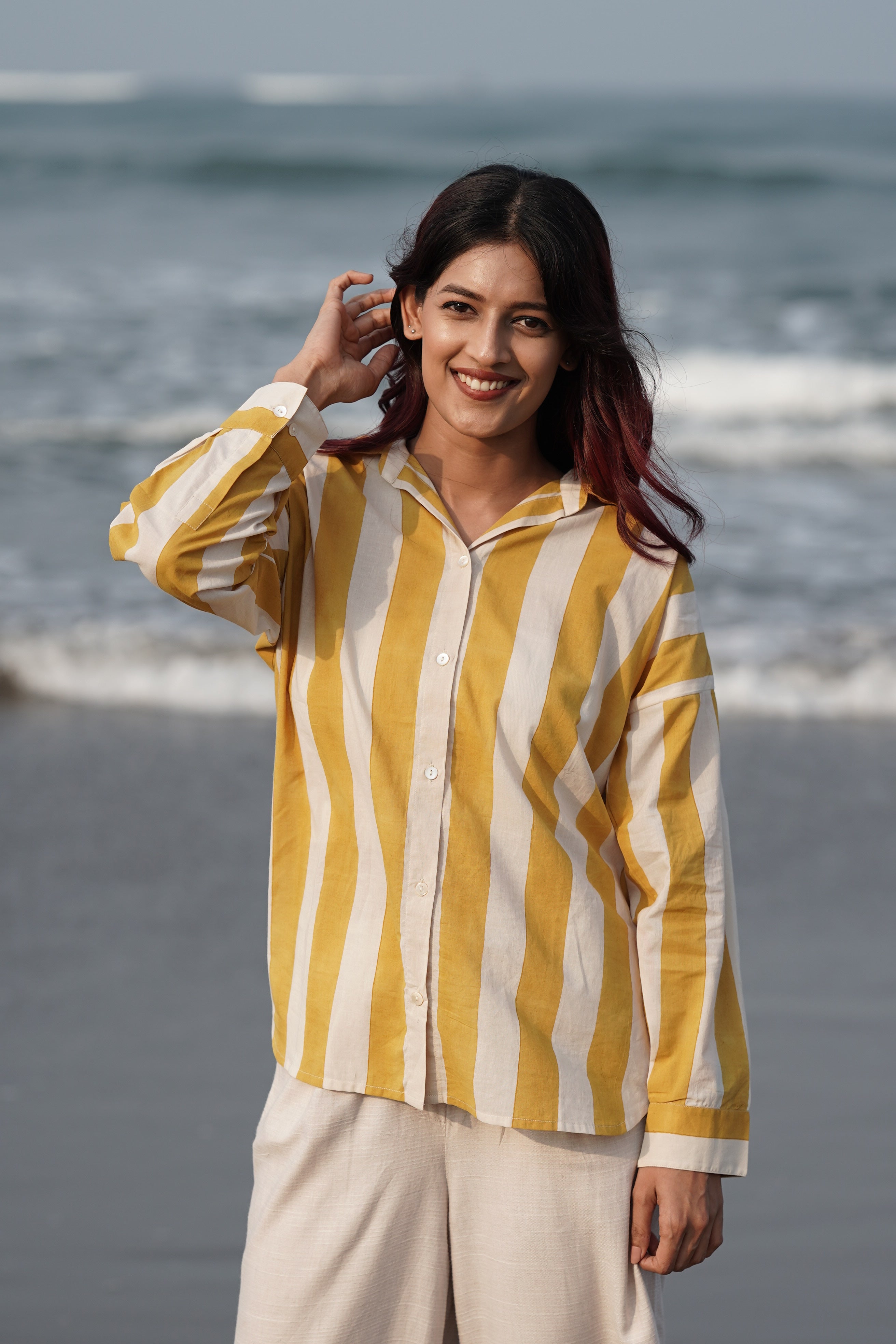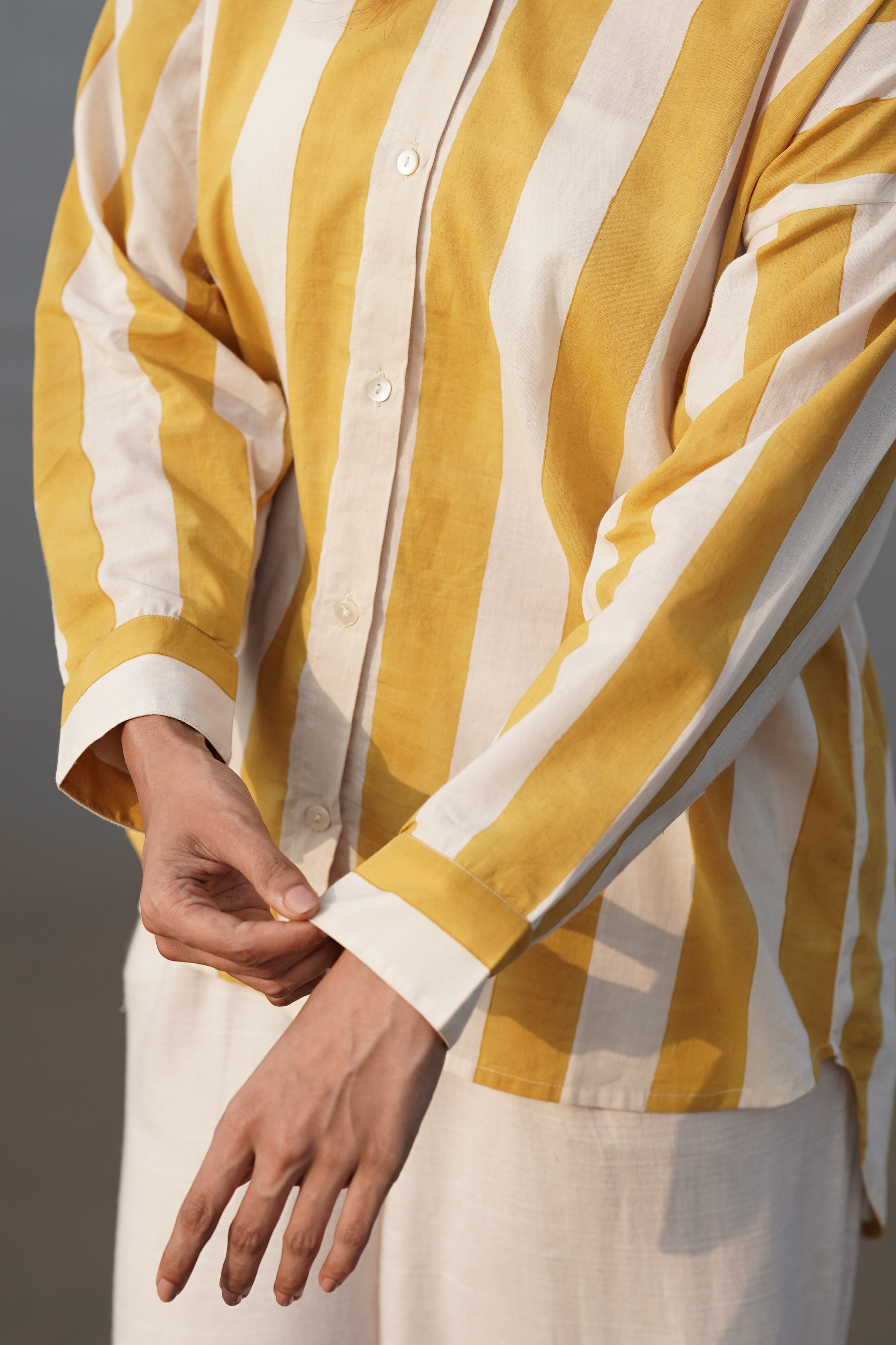 Broad handblock-printed stripes in a happy yellow hue, the kind that lifts your mood the moment you slip it on.