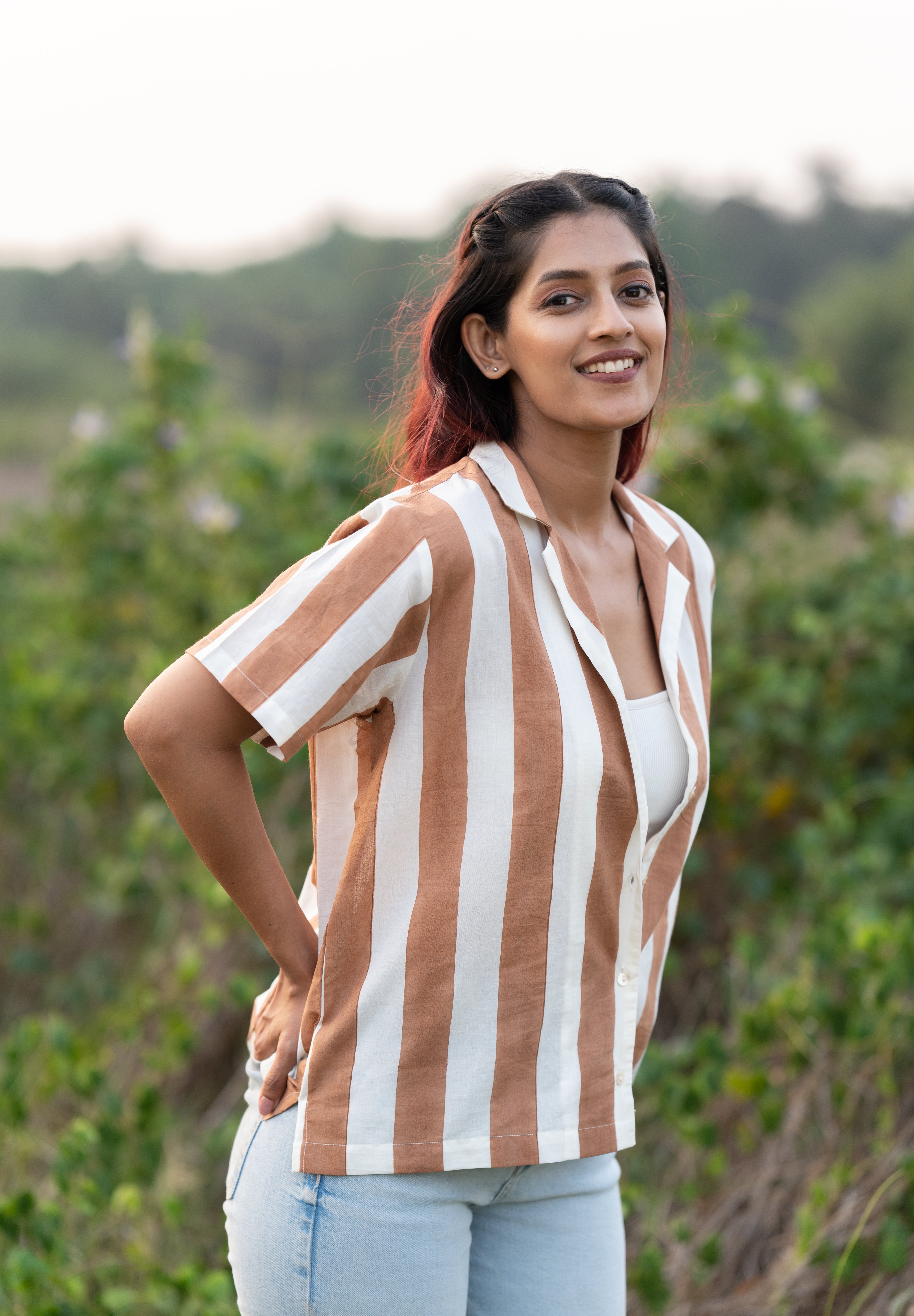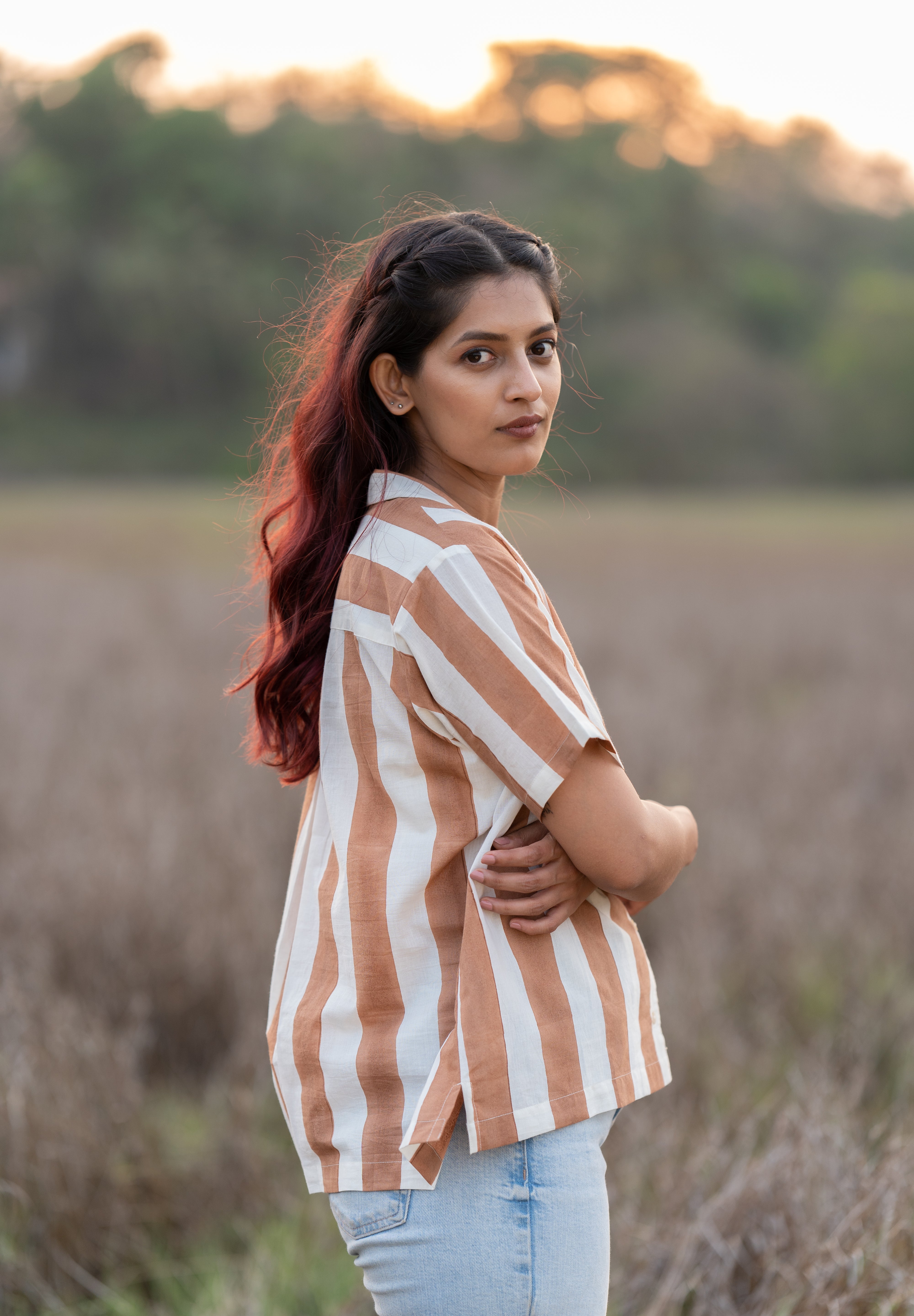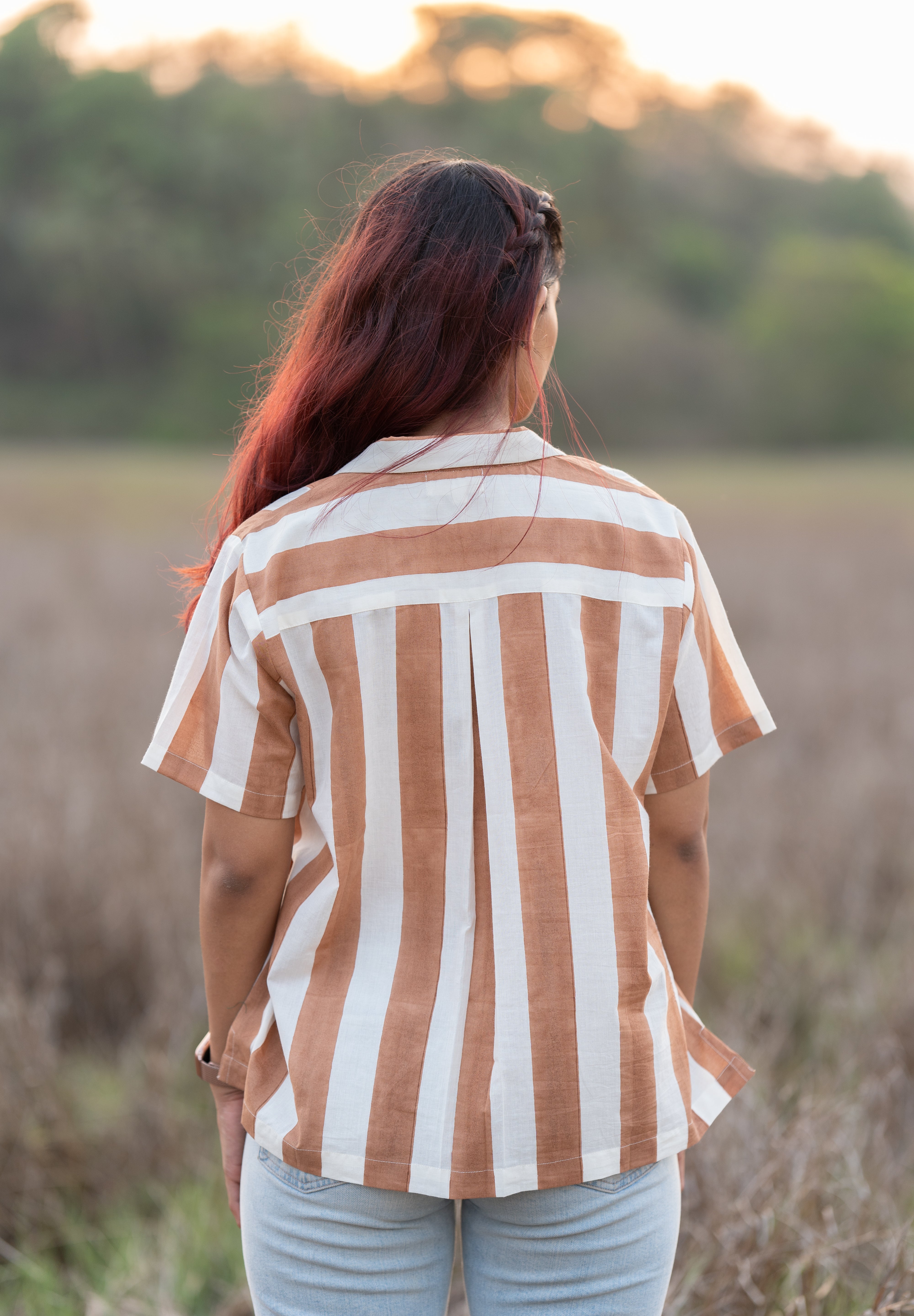 In warm, earthy brown, this shirt features broad vertical stripes, each one handblock printed with subtle irregularities that celebrate the artisan’s touch.