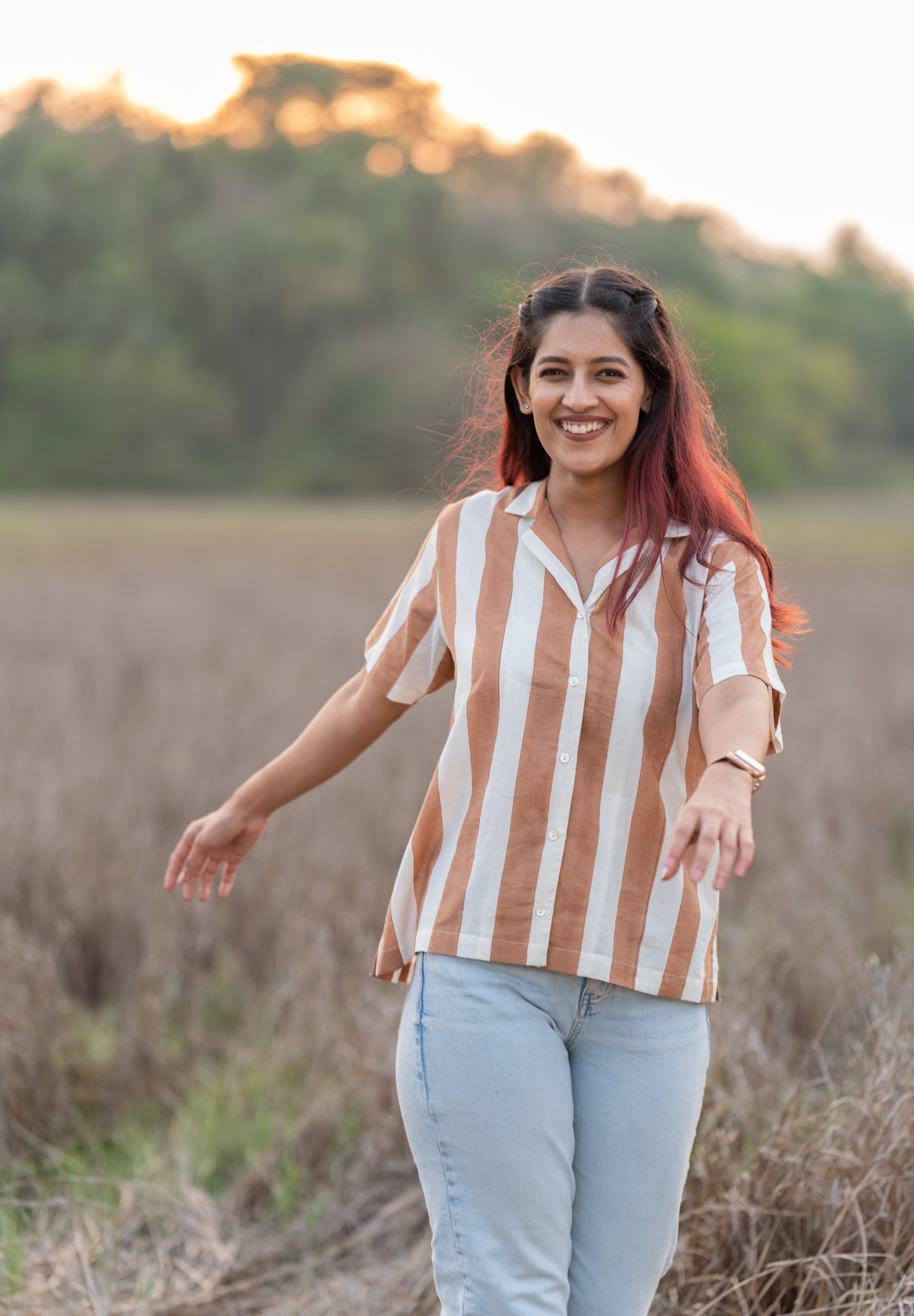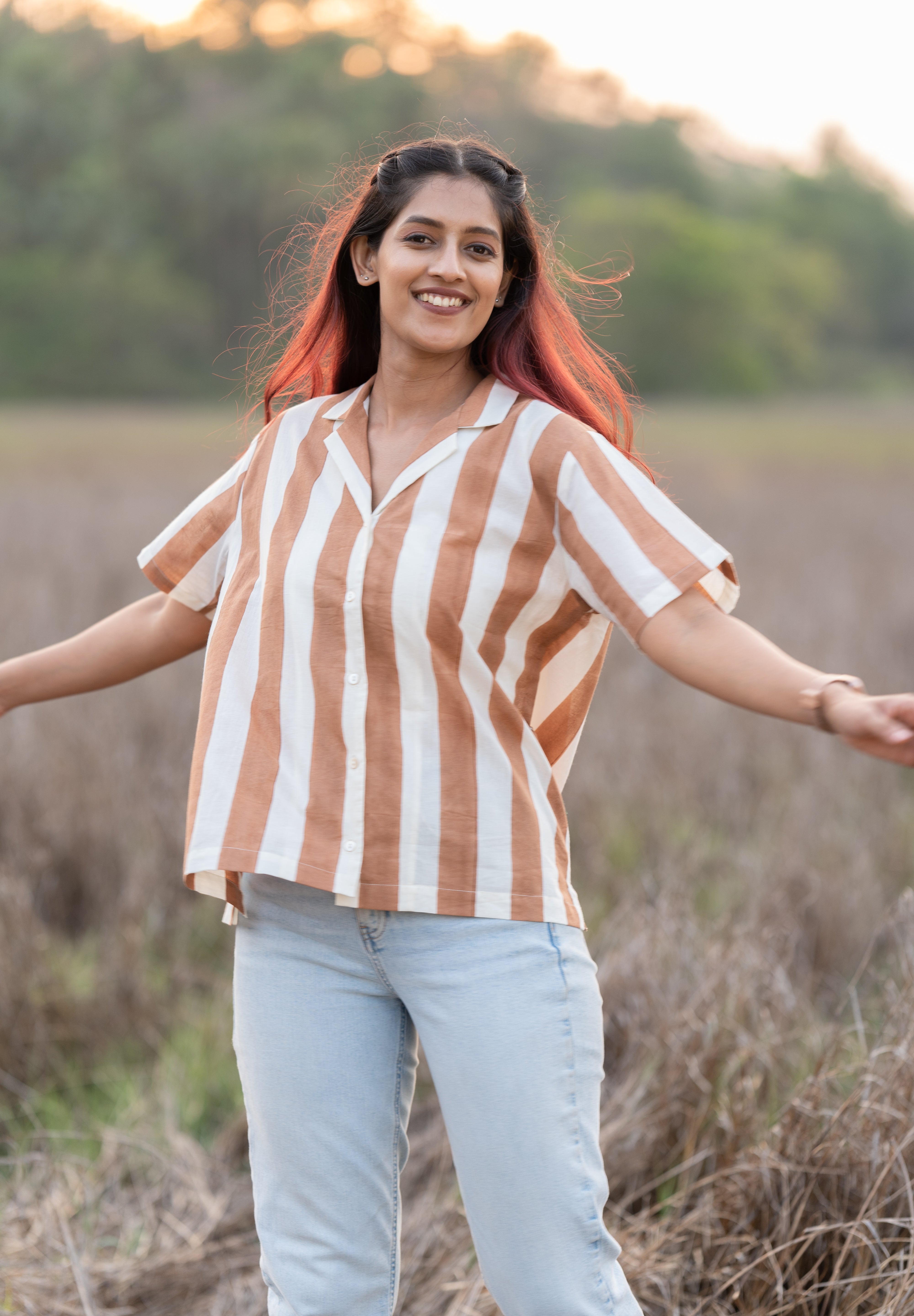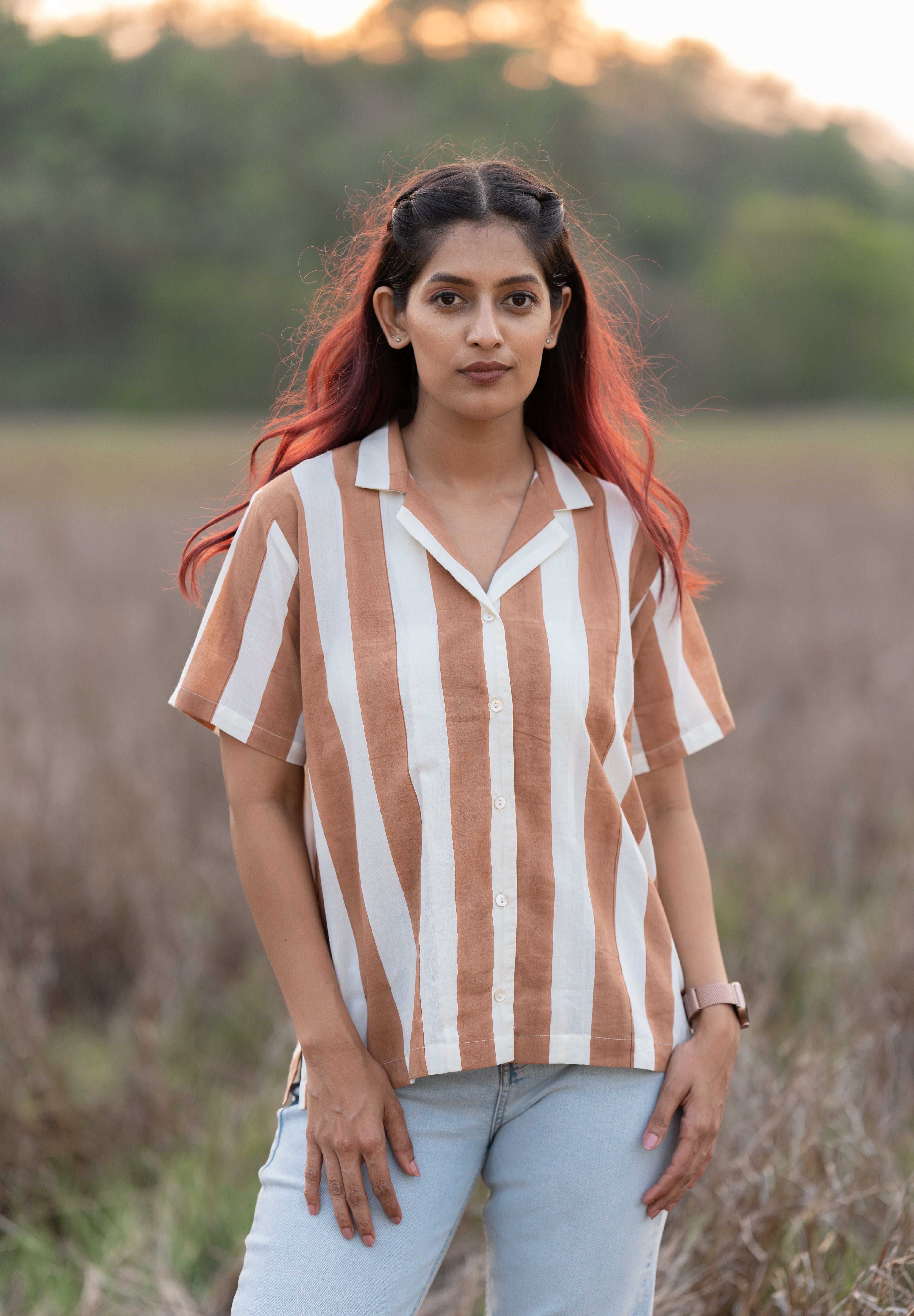 In warm, earthy brown, this shirt features broad vertical stripes, each one handblock printed with subtle irregularities that celebrate the artisan’s touch.